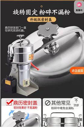 粉碎机品牌价格:李老师是推荐屹立和鼎历,我现在用的也是屹立牌200克的,效果还不错,家里自己打药粉足够了,价格200元左右,鼎历牌的粉碎机设计上有改进,盖子上有旋钮,密封性更好,不拧紧开不了机,安全性也更好,500克的鼎历牌粉碎机网上价格大概1000元多点。