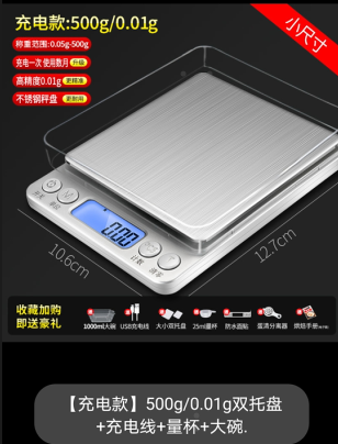 电子秤是我们制作散剂的必备工具,我们选择电子秤,要显示到小数点后2位0.00克,量程500克到1000克,电子秤的盘面最好是方型的,比较好放药材,电子称的显示屏要用发光二极管这种是比较专业耐用的,最好要有带充电的,交流电两种电源都可以用的,停电了也可以用,电子秤前面的面板上不能有凹槽,因为我们经常用来秤药粉,有凹槽不好清洁有药粉。