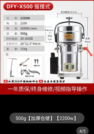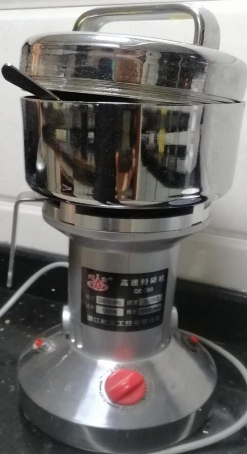 粉碎机现在各种牌子的都有,但是经过李老师多年使用的经验,还是要买一个大功率的高速的打粉机,比较耐用,打粉机的刀片越长,离边越近,打出来的粉就越细,刚开始我也用家里的豆浆机配的干磨杯打过药粉,但发现不好用,打不碎而且发热很厉害,没用几次刀片下面的密封圈就熔化了,毕竟不是专业的打粉的设备,而且中药中纤维比较多或比较软的药是很难打碎的。