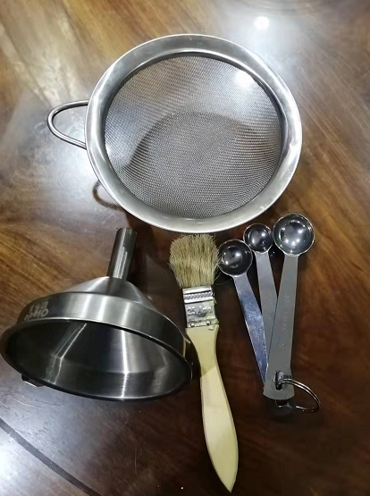 4、其他一些小工具,筛网,漏斗,平底铲子、扫子,小药勺、灰刀、钢丝球等,据袁师兄师兄介绍,筛网70目以上就很细了,我这个是用来做面包时筛面粉的,大概五六十目,平底铲子放在电子秤上不会摆动好装药,方便倒进粉碎机,不会漏出来,漏斗方便把药粉装进瓶子或者袋子里面,毛刷要买毛硬一点的,清扫打粉机叶片下的粉比较方便,小勺子是为了方便掌握药量,大小都有,用电子秤称一次1勺药粉有多重,就不用麻烦每次吃的时候都称一次,有师兄介绍小孩喝奶粉的勺子一勺就是三克左右,每种药粉的密度不一样,具体自己吃的药粉称一下1勺多少克,灰刀是用来刮粘在粉碎机碗底部的粉的,钢丝球可以清洁粉碎机内壁等地方粘的药粉,粉碎机说明书上说明不能用水洗,避免漏电。。